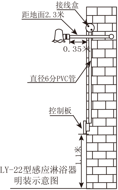 2 、在淋浴喷头的正下方的墙壁上,用铅笔直尺划一直线垂直至距离地面约 1.1 米 处,把后盖上左右两个孔上打两个膨胀管,用螺丝固定在墙上,然后把感应器扣在后盖上即可。